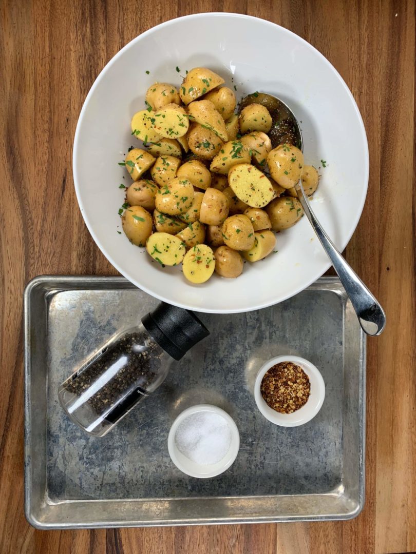 Preheat oven to 425F. In a large bowl, toss potatoes, oil, garlic, and herbs. Season with salt, pepper, and a pinch of red pepper flakes. Pour into a sheet pan or baking dish.