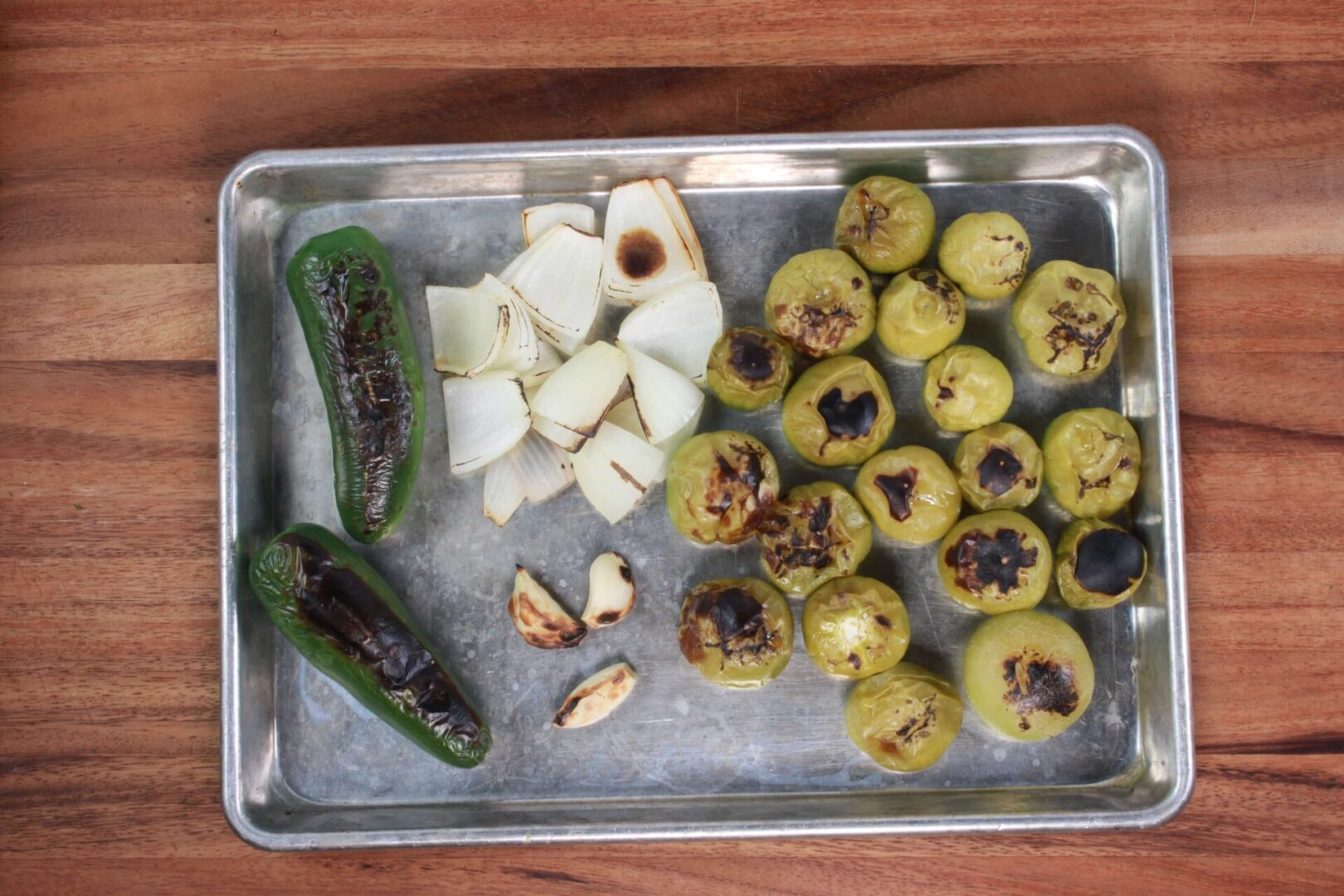 Place tomatillos, jalapeno, yellow onion, and garlic on a sheet pan and place in the oven for 10-12 minutes to get some roast color on the vegetables.