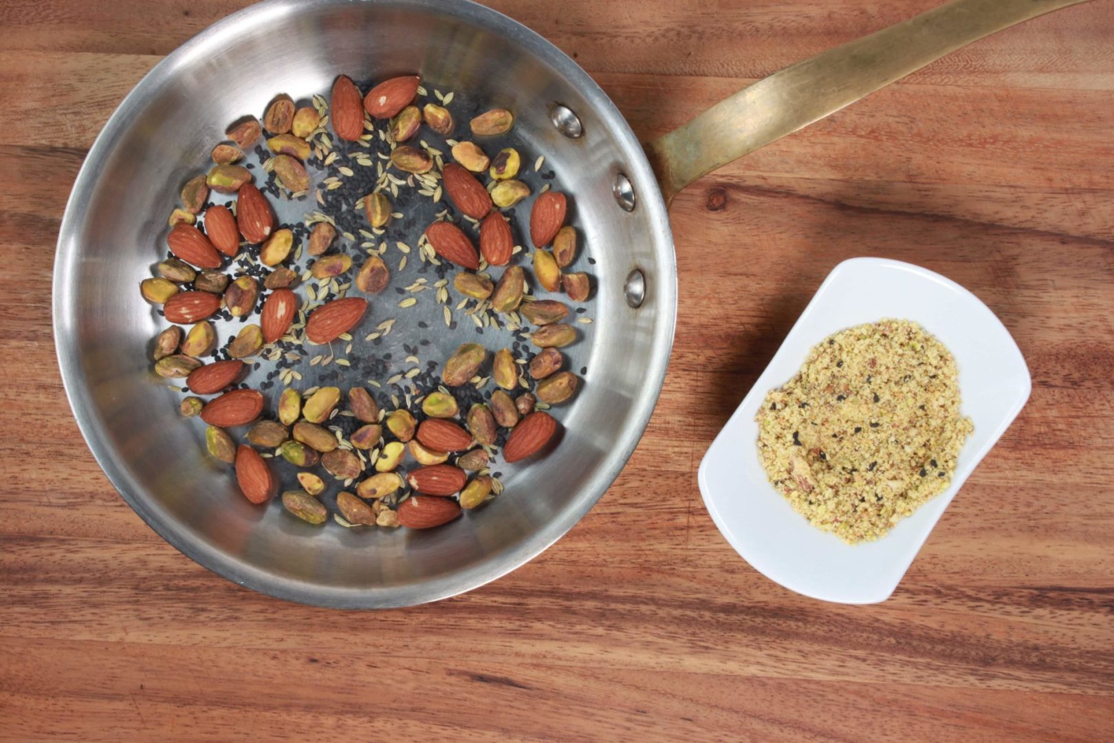 Add the toasted nuts and seeds to a spice grinder and pulse for a few seconds to reach a coarse mixture.