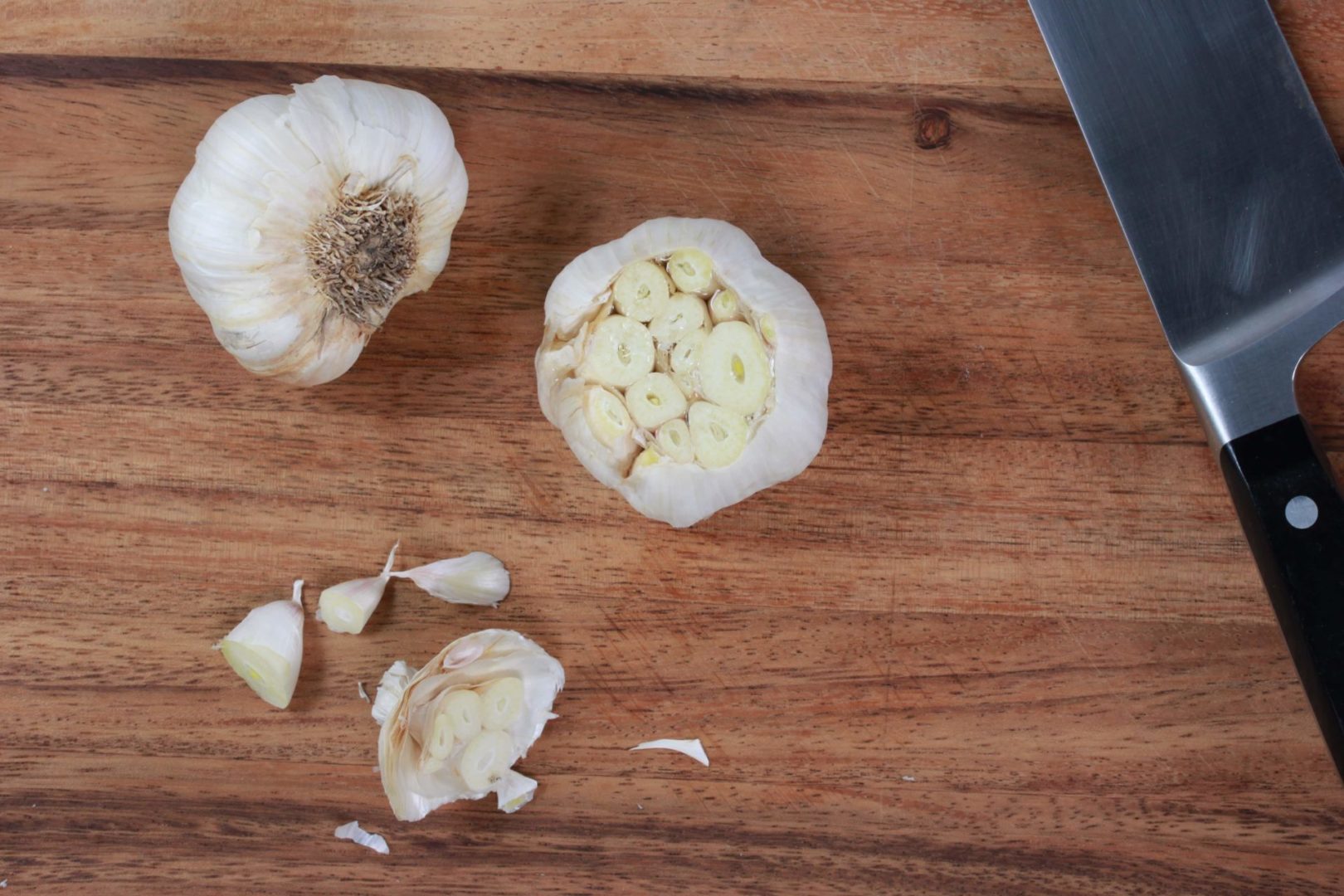 Set the oven to 350F. While it pre-heats, cut off ~¼ of the way from the top of the garlic, exposing the cloves. Drizzle olive oil over the garlic and wrap tightly with aluminum foil. Bake for about 50 minutes, until golden brown and tender.