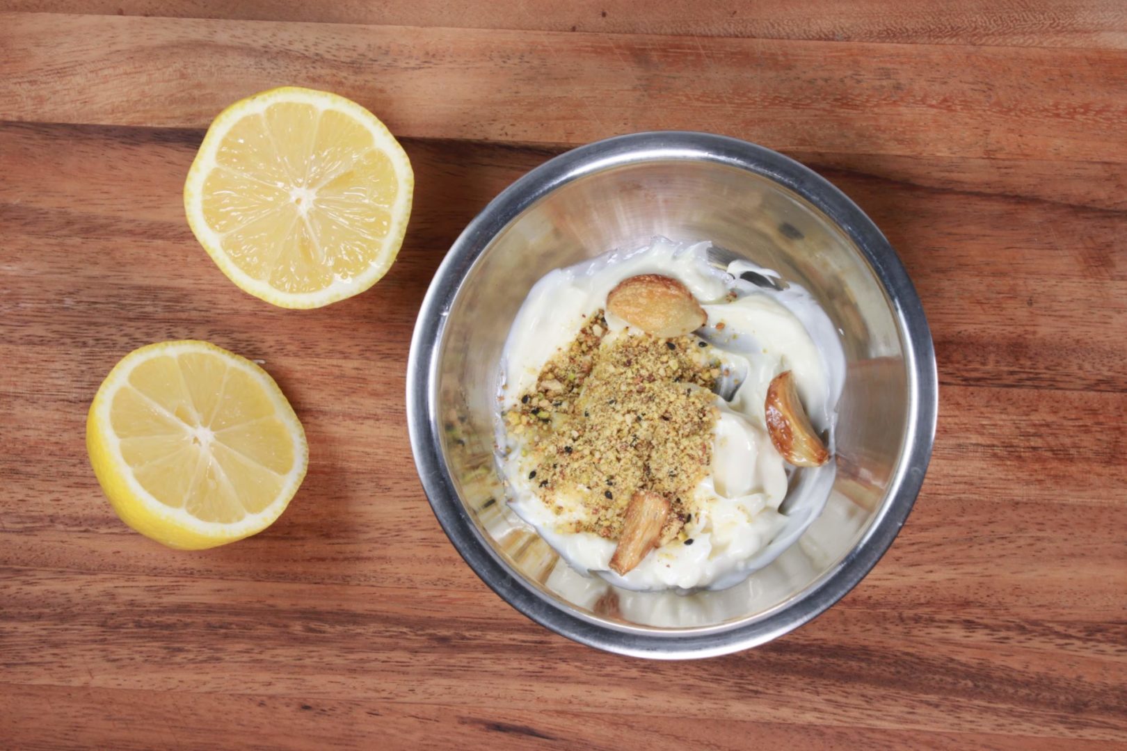 In a small bowl mix mayo, lemon juice, roasted garlic, and the spice blend.