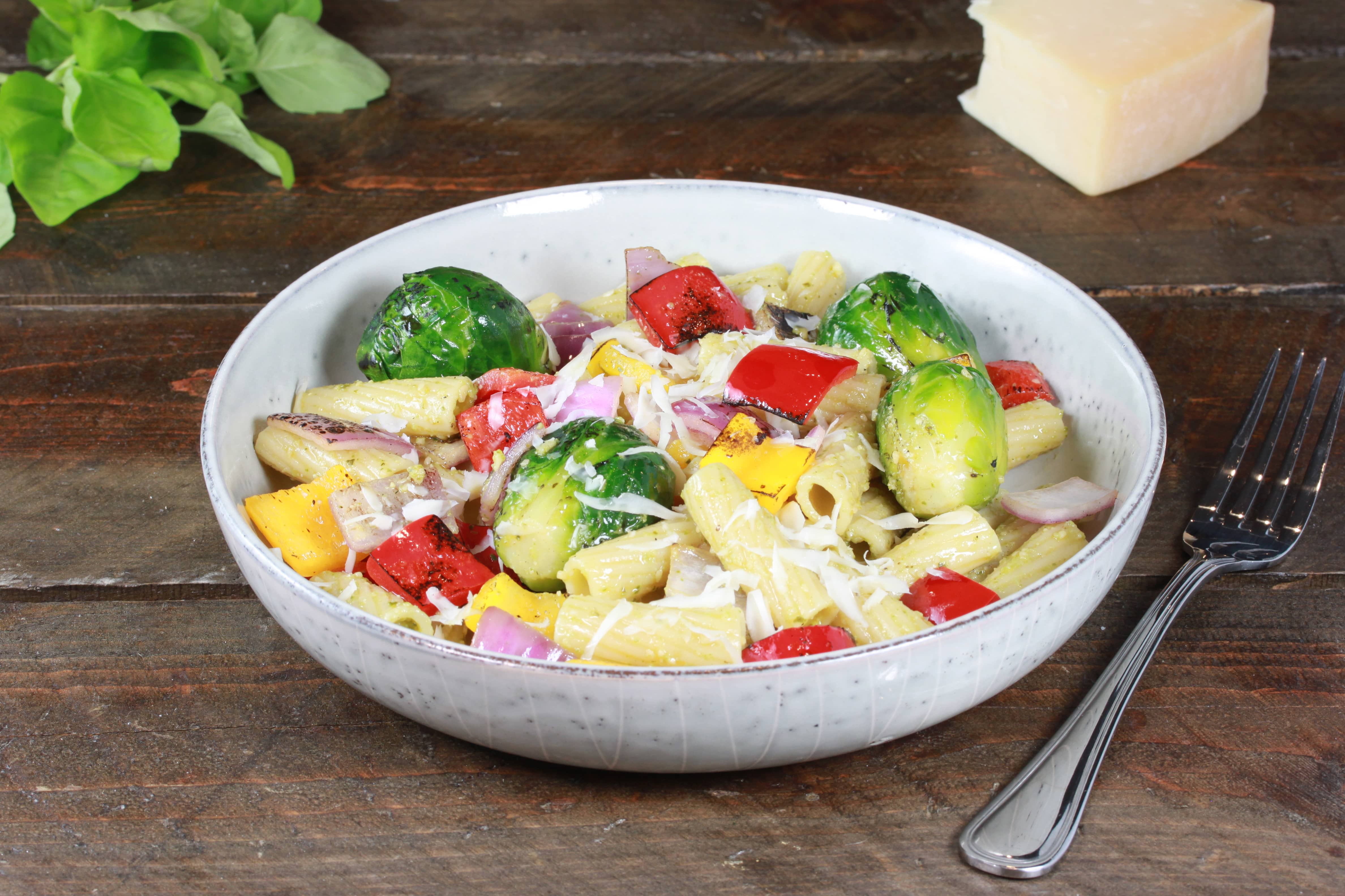 1 Package of Uncooked Rigatoni Pasta, 3 cups PuraVida Vegetable Mélange, ¼ cup Butter, 3-4 Garlic Cloves, minced, 1 tsp Red Pepper Flakes, 1 Tbsp Fresh Basil, 1/3 cup Parmesan Cheese, grated, 2 tbsp Olive Oil, 2 tbsp fresh lemon juice, Salt and Pepper, to taste