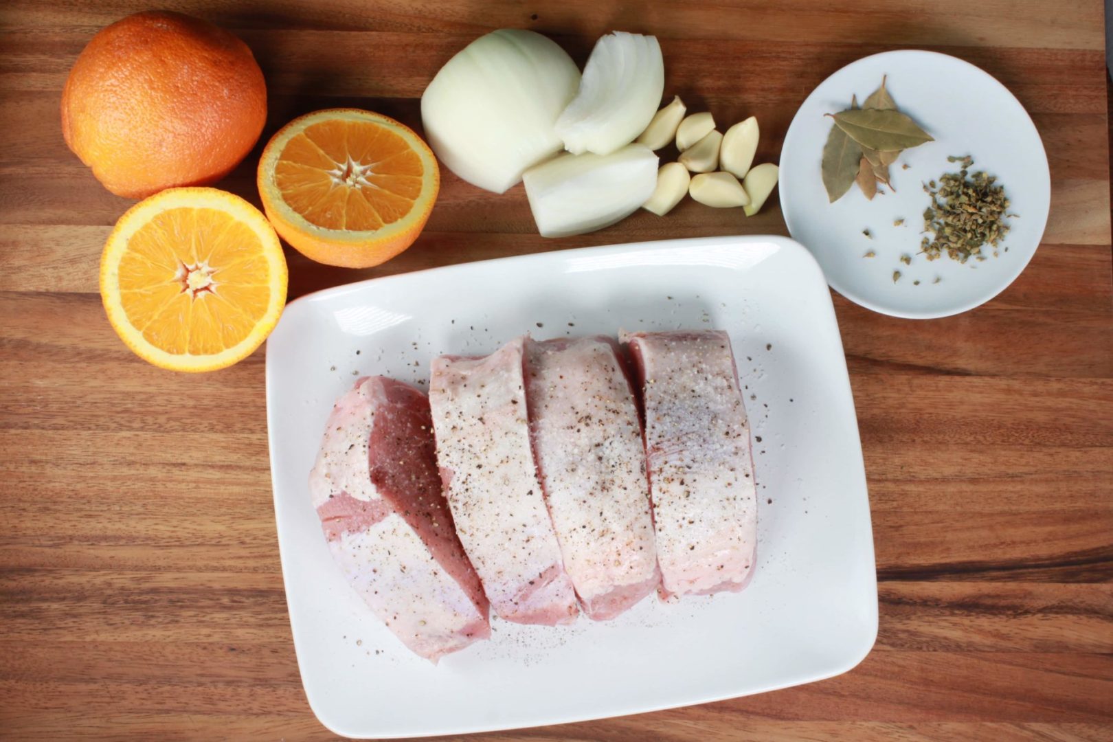 In a blender combine orange juice, yellow onion, garlic, bay leaves, oregano, and chicken stock. Blend to a smooth consistency and pour into the slow cooker with the pork.