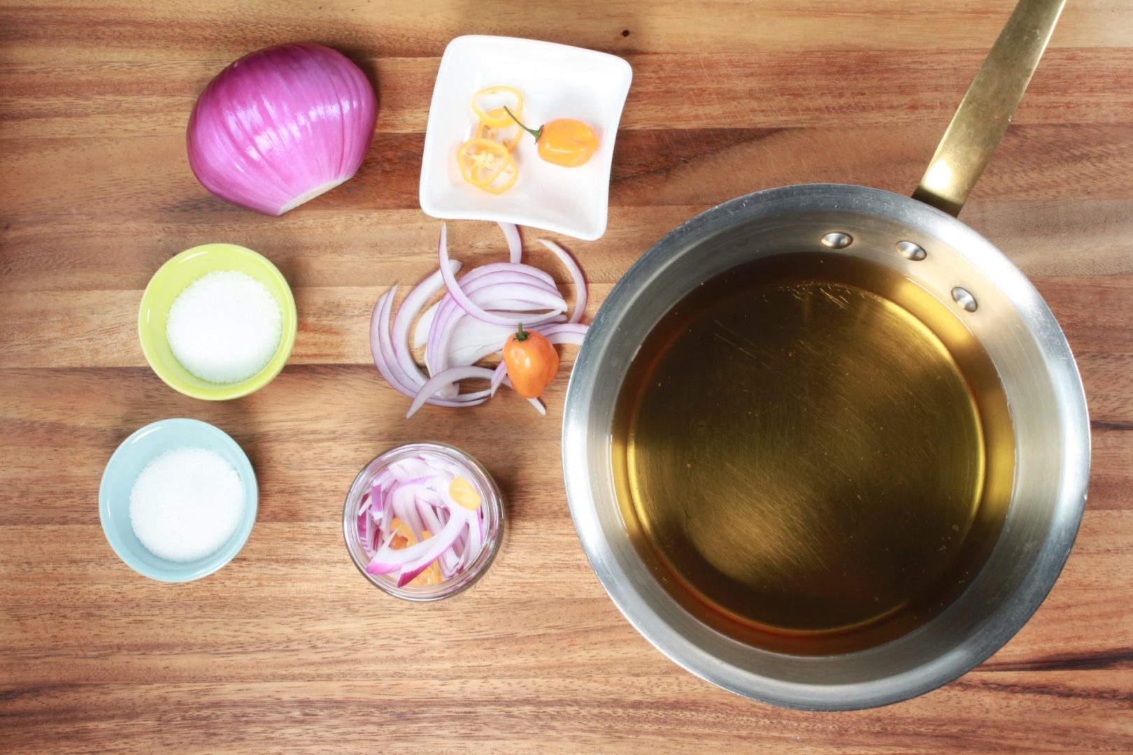 Bring to a boil, then pour over the sliced onion and habanero.