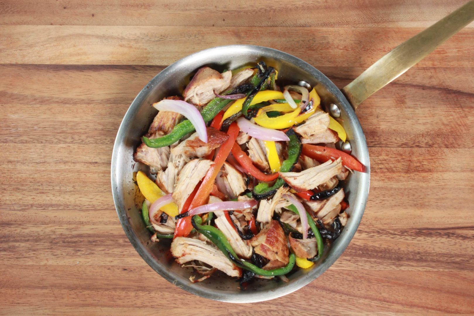 Heat a skillet over medium high heat, add PuraVida Fajita Rajas and shredded carnitas to get them crispy.