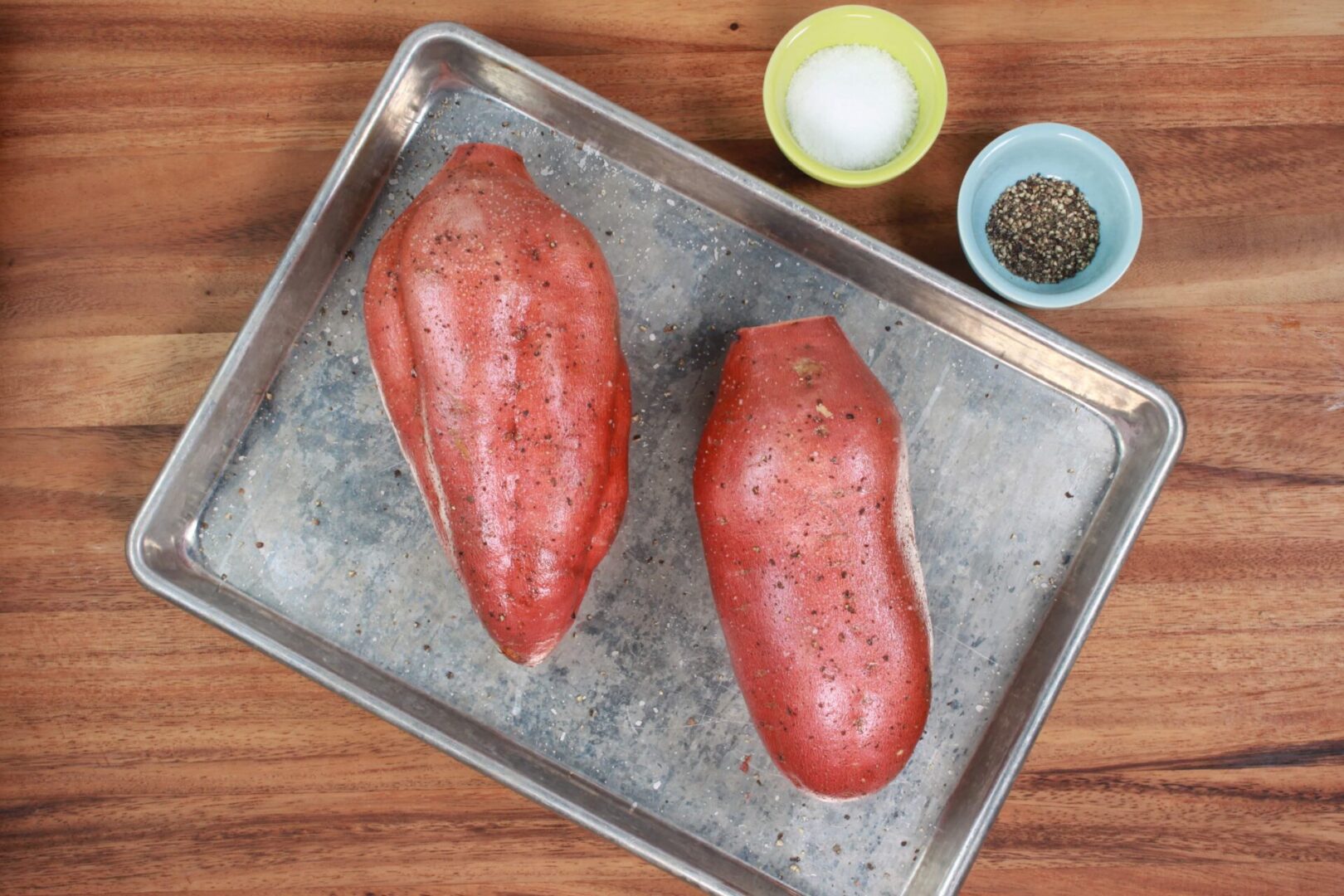 Place sweet potatoes on baking sheet. Brush them with oil and season with salt and pepper.