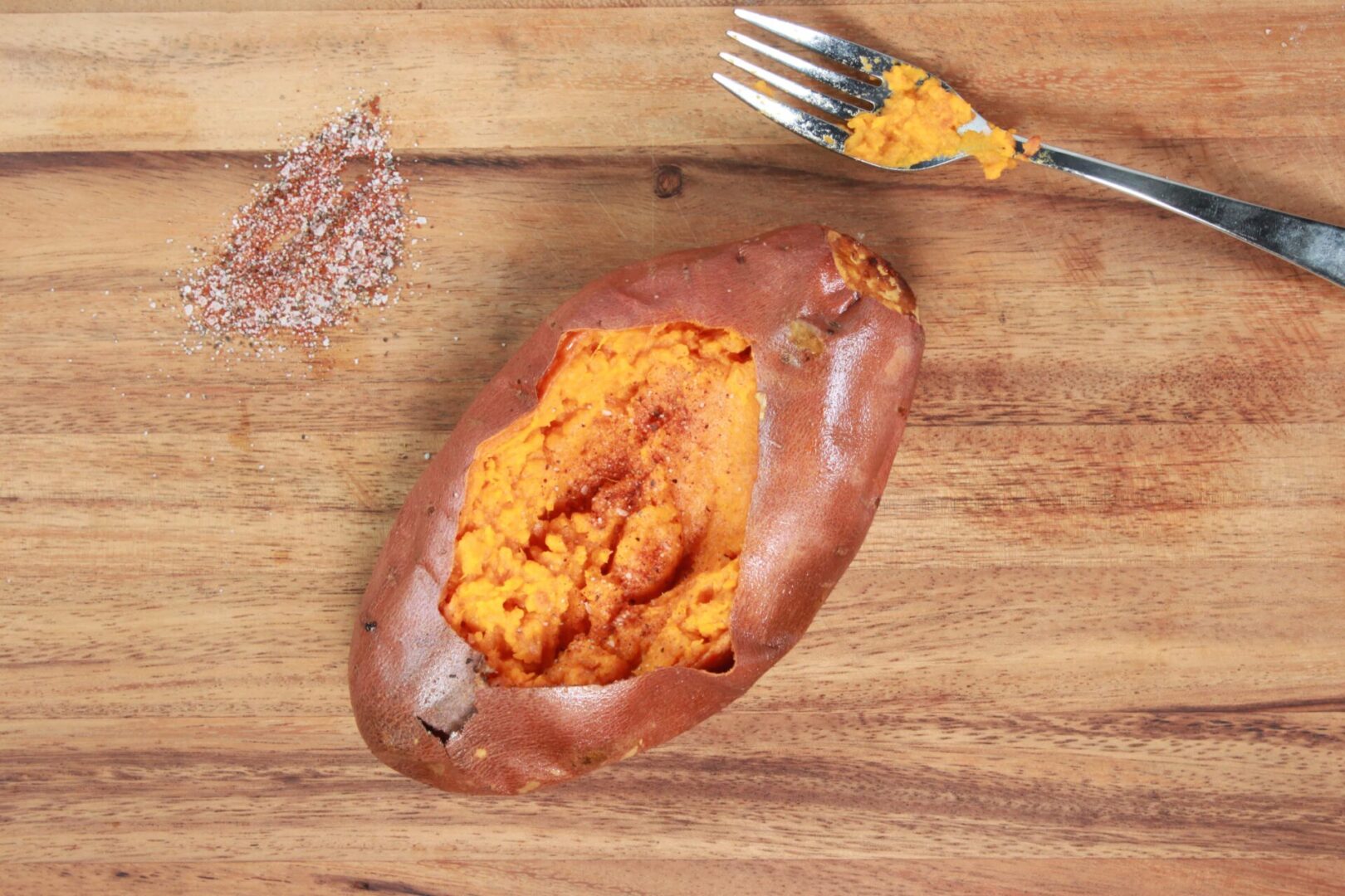 Slice open the sweet potatoes and add the spices. Using a fork, mash the flesh inside to mix the seasoning well.