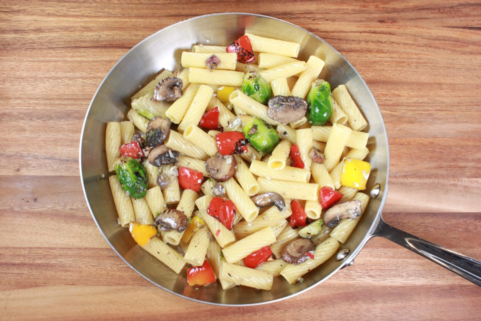 Once pasta is cooked, drain and add to the pan with the PuraVida Vegetable Mélange