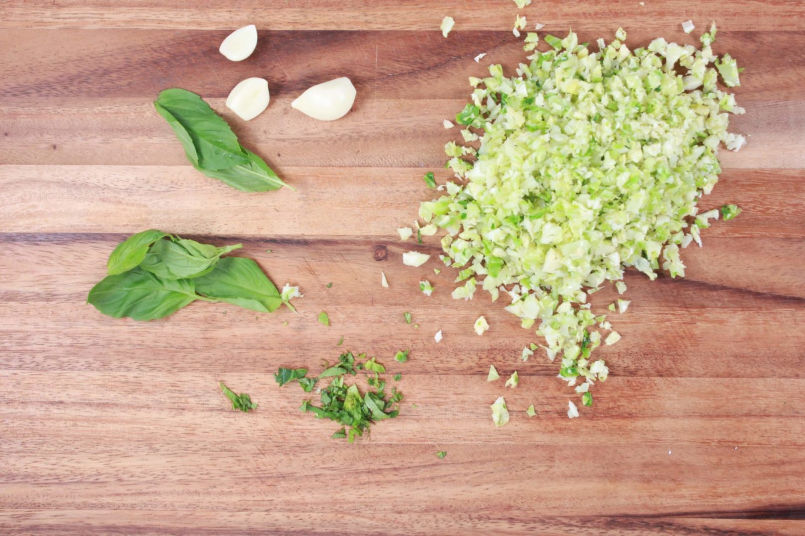 Chop the fresh basil, garlic and Brussels sprout trimmings and add to a bowl.