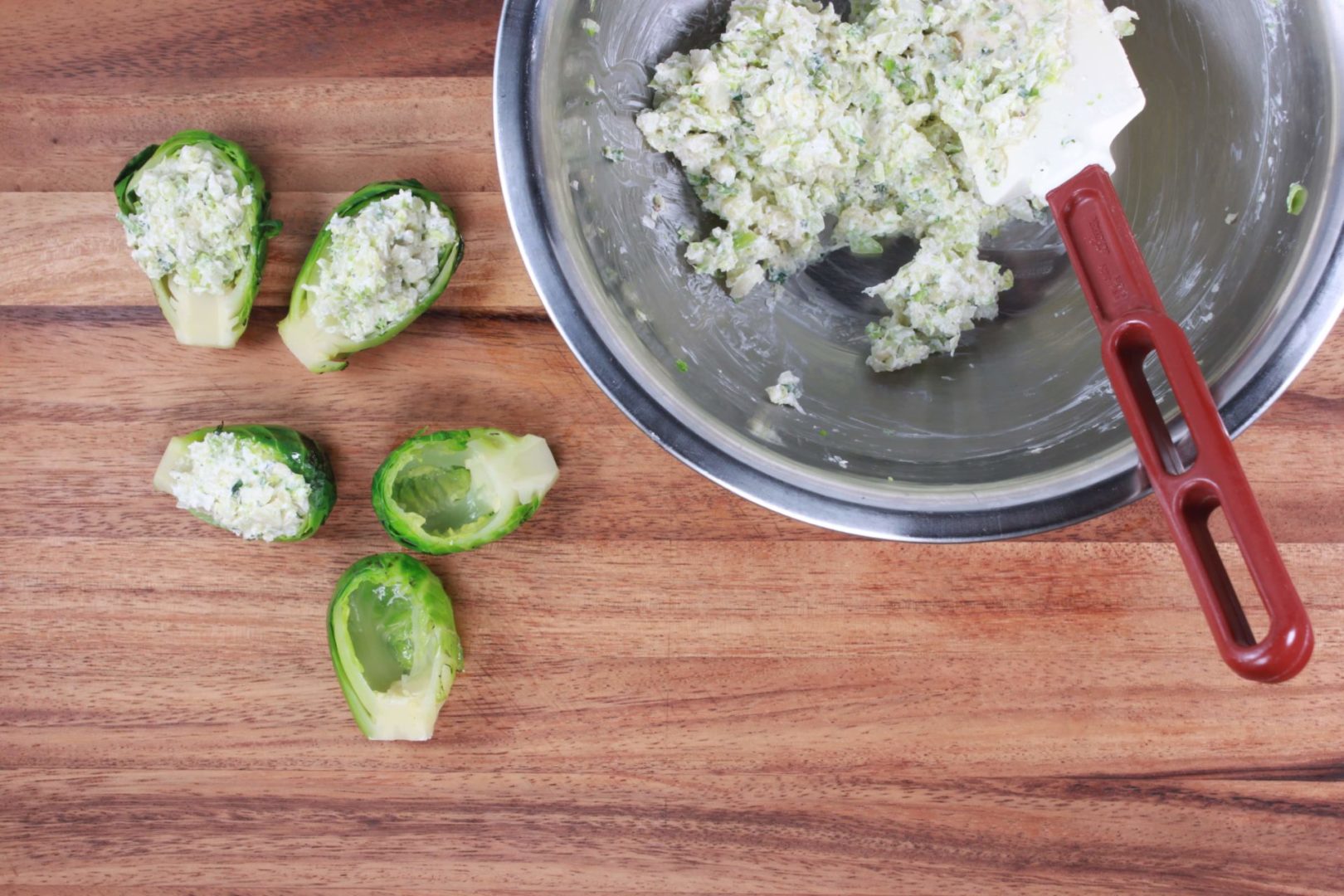 Spoon the mixture into brussels sprouts shells and place on a baking sheet.