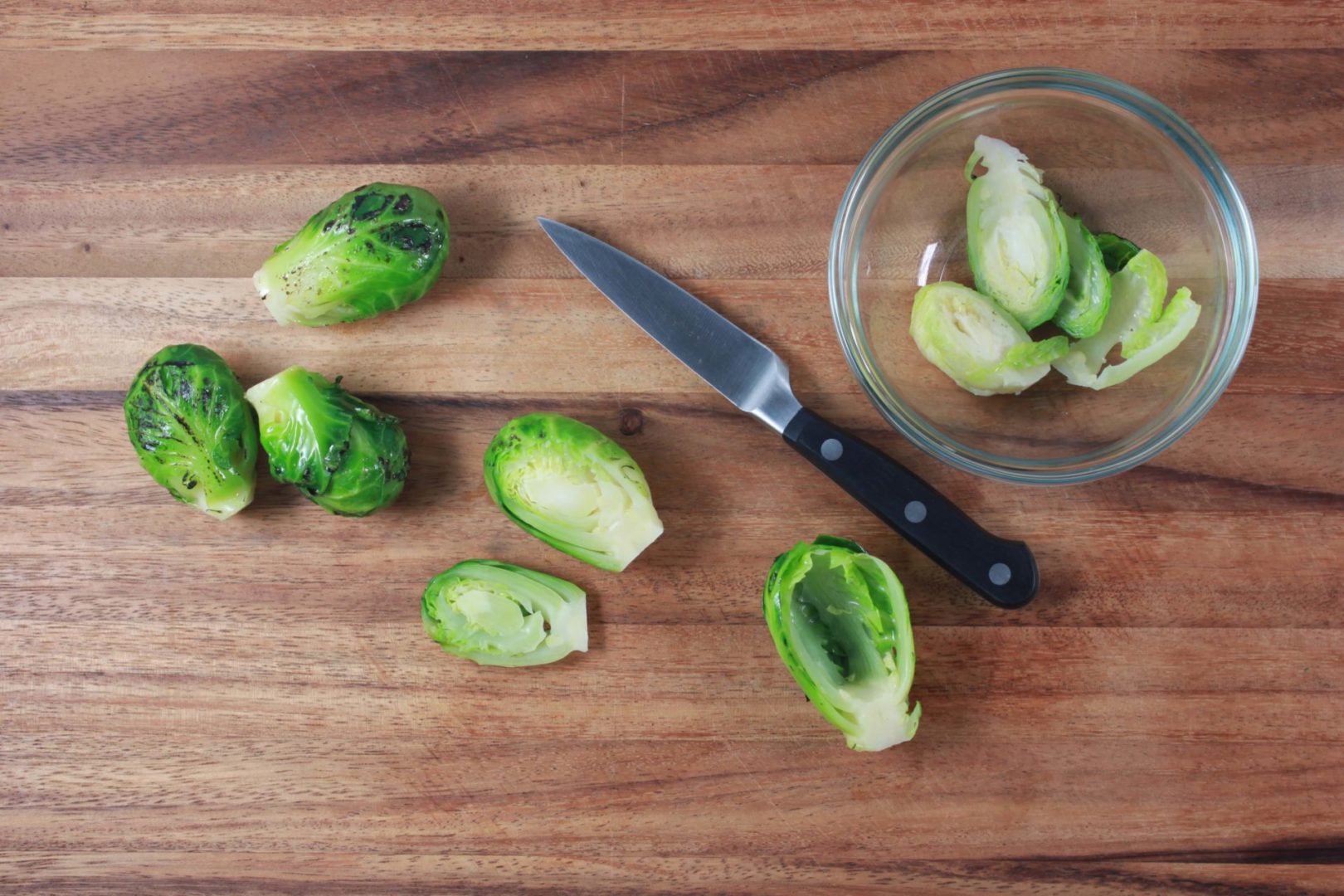Using a paring knife, scoop out the inside of the PuraVida Fire Roasted Brussels Sprouts. Set aside the inner portion to use in the filling.